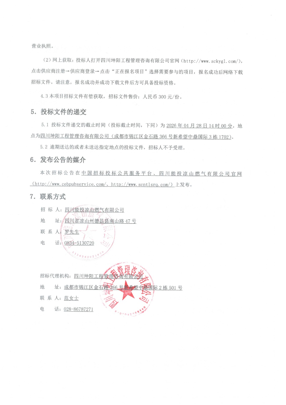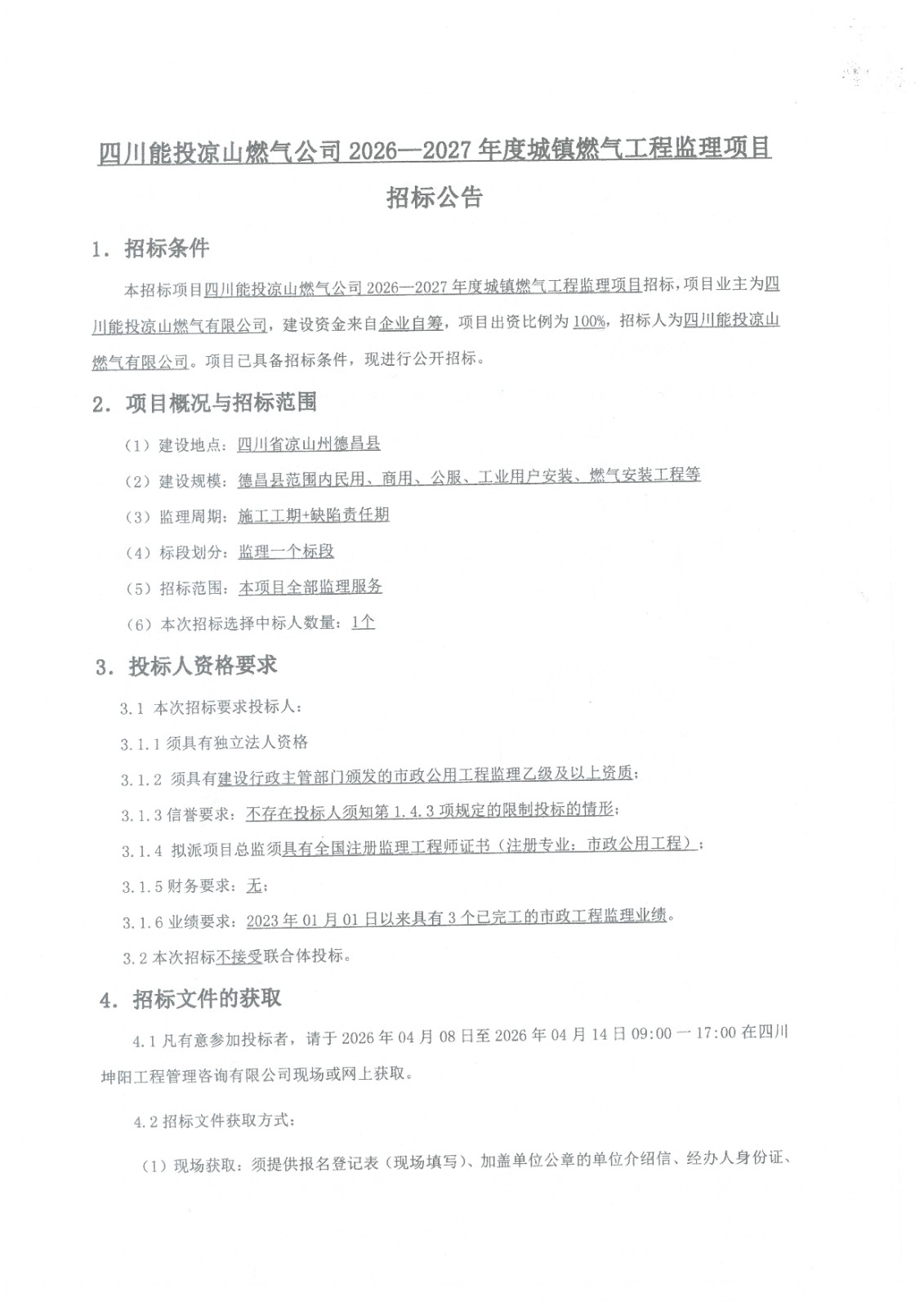 四川能投凉山燃气公司2026一2027年度城镇燃气工程监理项目招标公告